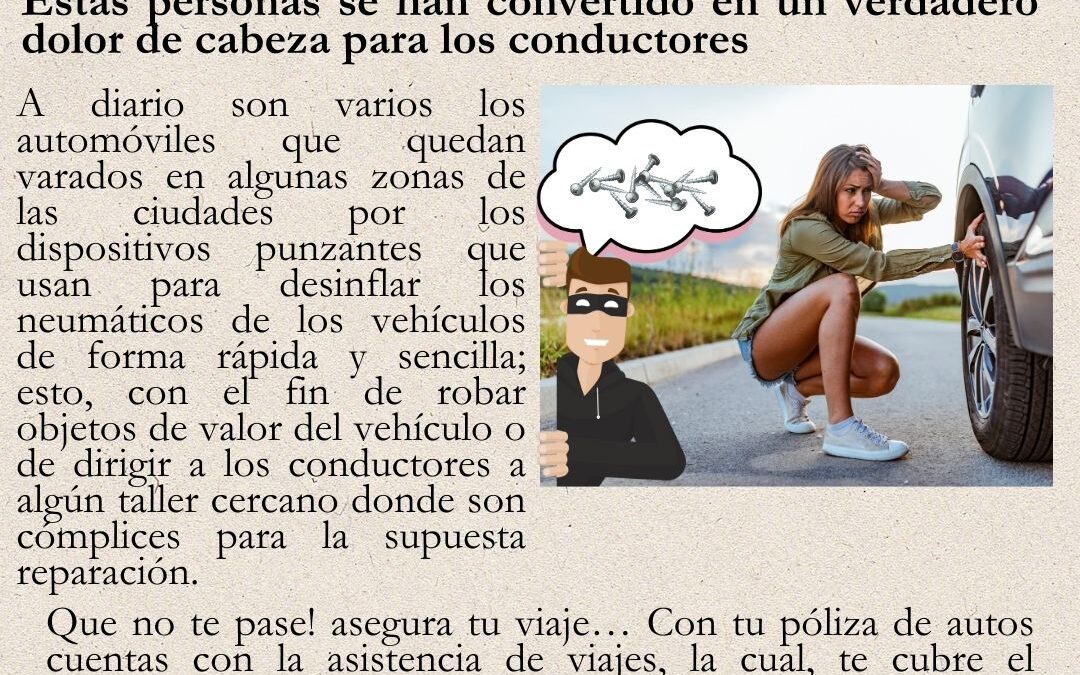 A diario son varios los automóviles que quedan varados en algunas zonas de las ciudades por los dispositivos punzantes que usan para desinflar los neumáticos de los vehículos de forma rápida y sencilla; esto, con el fin de robar objetos de valor del vehículo o de dirigir a los conductores a algún taller cercano donde son cómplices para la supuesta reparación.